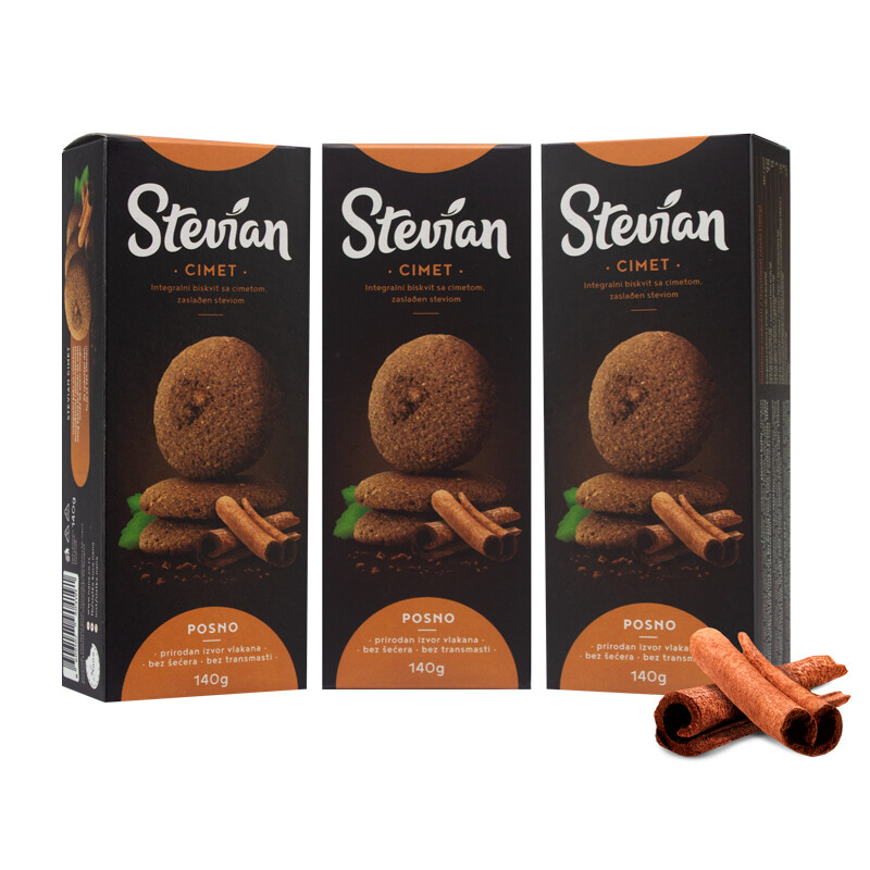 Stevian cimet je ručno napravljen keks od integralnog brašna celog zrna pšenice sa dodatkom lekovitog začina cimeta. Kompletnost i jednostavnost ovog keksa je primer da malo može da znači mnogo!